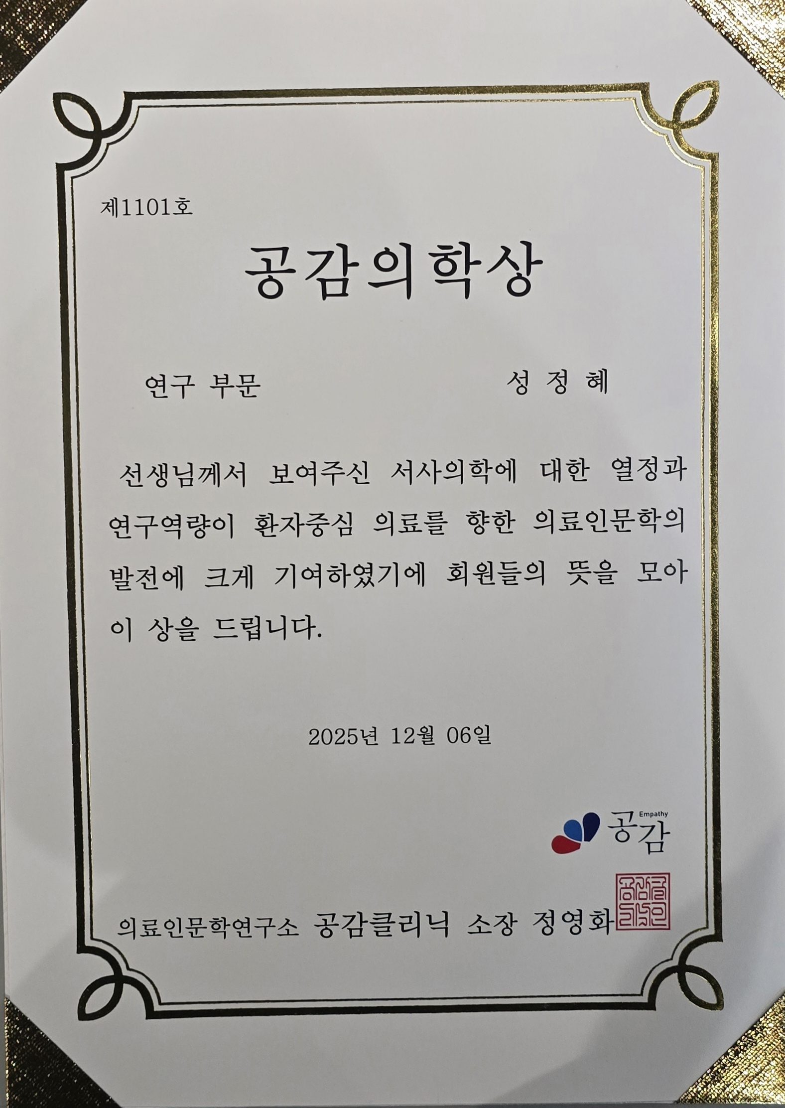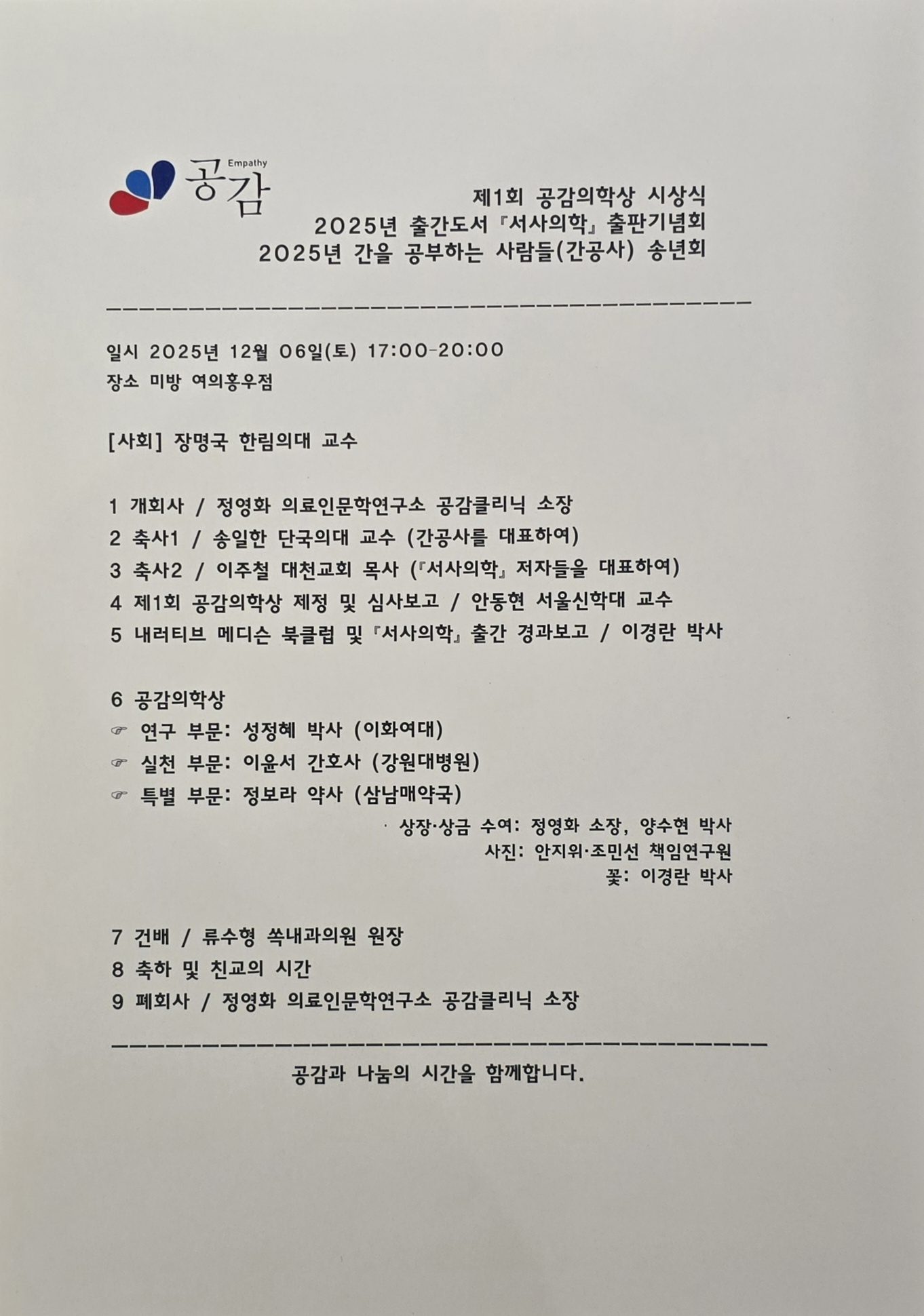 제1회 공감의학상 수상자 공고
